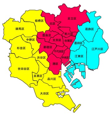 足立区、荒川区、台東区、中央区、港区、千代田区、文京区、北区、豊島区、新宿区